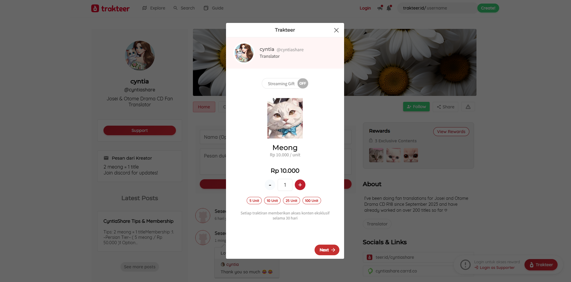 1 Trakteer (Meong) is worth 10000IDR (~0,62USD)