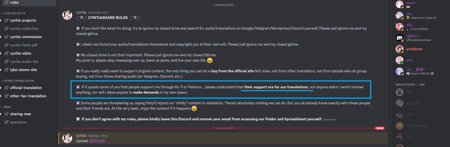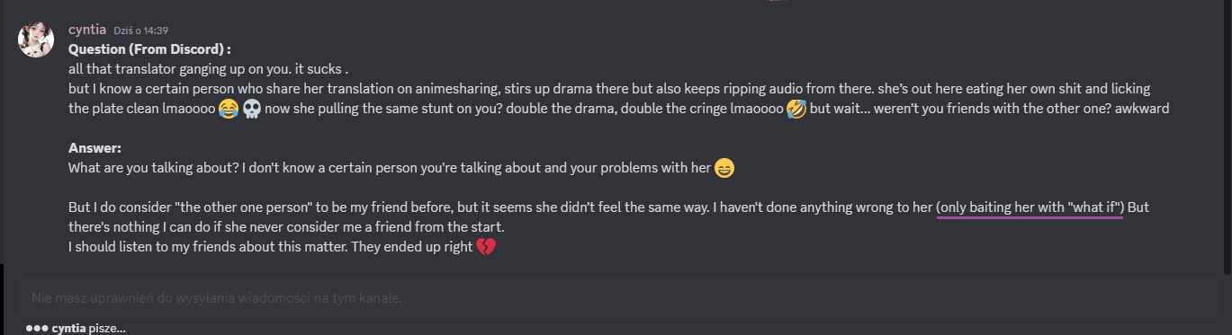 Cyntia. I know that people have their own lives, they work, they study, they have friends and maybe many other hobbies. But you’re writing this like it’s some challenge to waste your time on your hobby. You aren’t creating your translations by yourself (I mean usage of AI), you aren’t fixing your translations, you aren’t buying Drama CDs, you don’t do anything on Discord other than answering questions that you later delete, so practically you do nothing for the community if they can’t even see your work. I currently update 8 spreadsheets, 4 of them daily, rest of them every week or so. All of my spreadsheets have more than 500 entries. It doesn’t take THAT much time if you LIKE IT. You add one entry per I don’t know, week? To only one spreadsheet – the one with anime-sharing download links. It takes maybe 5 minutes to add this. If you can’t spend your precious 5-10 minutes daily on all of these things then why do you even run your own Discord server, site and spreadsheets?