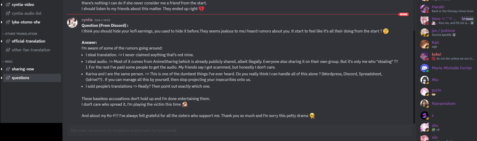 Why do you feel the need to remove chatting channel from your Discord server where all members are verified by you – meaning everyone is controlled by you and you can ban people that don’t like you. Btw it’s 3 months now when I’m writing this since this announcement and you still can’t chat on her server.