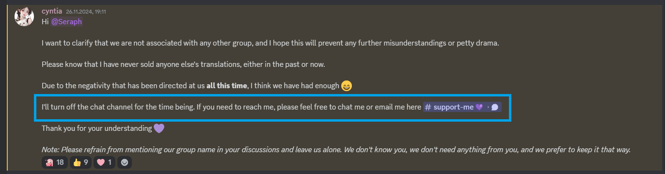 Now that’s interesting. Be it intentional or unintentional… Cyntia instead of putting her e-mail in this announcement, she prefers redirecting people to channel where her Patreon, Ko-Fi and Trakteer links are. As I said, I don’t know if she did it purposely or not, but I thought it’s interesting.